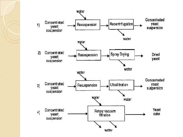 v Two main types of baker’s yeast are produced, compressed (cream) yeast and dry yeast. v The first stage of yeast production consists of growing the yeast from the pure yeast culture in a series of fermentation vessels. v The yeast is recovered from the final fermentor by using centrifugal action to concentrate the yeast solids.