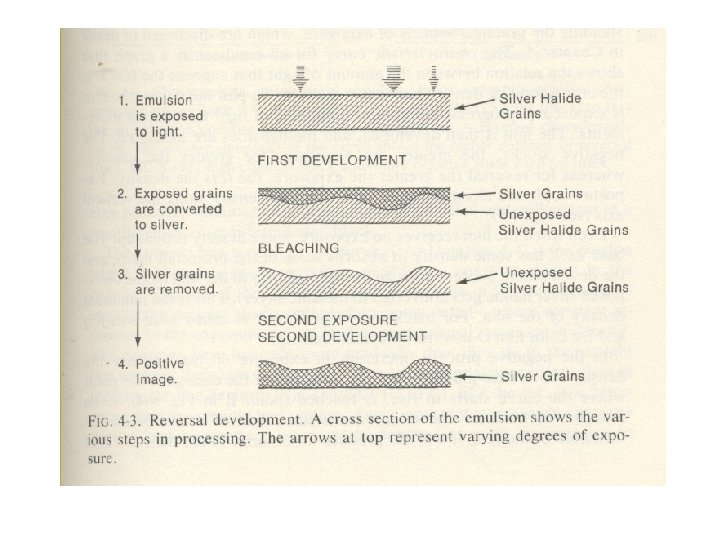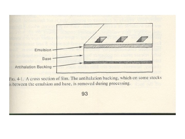 Production Phase • How does the film record the image? – In the instant that the shutter opens and closes, exposing the film frame to light, a chemical reaction takes place on the surface of the film. The coating of emulsion, which is composed of light-sensitive silver halide, is burned away in various degrees (depending on the intensity of the light) leaving behind a “latent image” that is revealed once the film has been processed. The following two slide illustrates this.