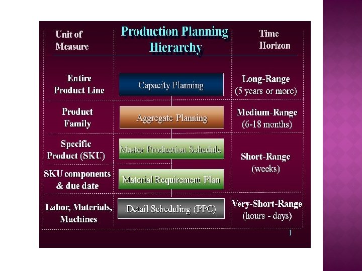 Long Term (Capacity Planning) Capital Intensive in nature - This deals with Strategic and business issue. In the long term we deal with those issue which help us to create demand for our products and generating sufficient revenue for the company. - Reflect in process choice and equipment selection. Since selection of equipment and facilities require lot of investment and decision is irreversible, one should pay utmost care keeping in mind customer requirements. Medium Term (Aggregate Planning) - How demand can be met from existing facilities and resources. Here we are trying to utilizing our existing resources (manpower, machine, facilities etc) to satisfy the market demand