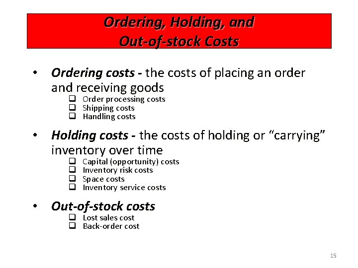 Holding Costs Category Cost (and range) as a Percent of Inventory Value Housing costs (building rent or depreciation, operating costs, taxes, insurance) 6% (3 - 10%) Material handling costs 3% (1 - 3. 5%) (equipment lease or depreciation, power, operating cost) Labor cost Investment costs 3% (3 - 5%) 11% (6 - 24%) (borrowing costs, taxes, and insurance on inventory) Pilferage, space, and obsolescence Overall carrying cost 3% (2 - 5%) 26% 16