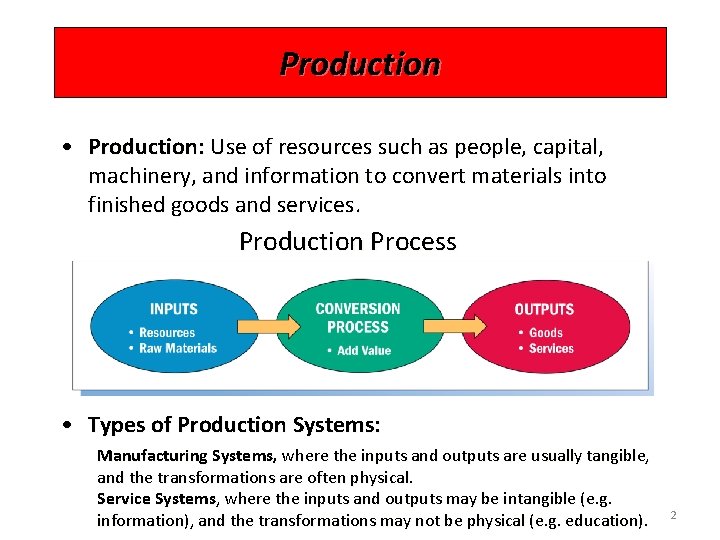 Production • Production: Use of resources such as people, capital, machinery, and information to convert materials into finished goods and services. Production Process • Types of Production Systems: Manufacturing Systems, where the inputs and outputs are usually tangible, and the transformations are often physical. Service Systems, where the inputs and outputs may be intangible (e. g. information), and the transformations may not be physical (e. g. education). 2