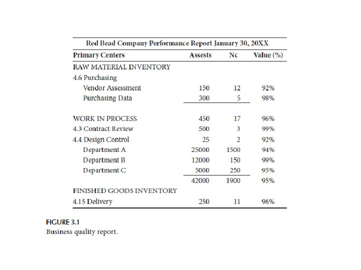 The Business Quality Report • The business quality report (also known as a performance report) is a listing of the firm’s primary and support responsibility centers’ activities on a given date (see Figure 3. 1). • The body of the statement contains four major sections: – center activities, – number of outputs (assets) generated, – amount of nonconformance (nc), – calculated value (percentage).