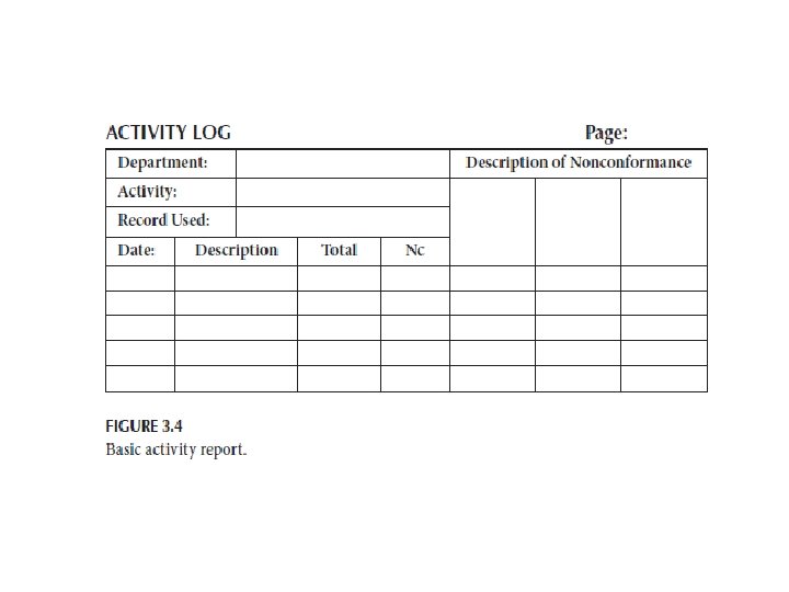 Activity Reporting • The simplest form used is a multicolumn form, called an activity report or log (see Figure 3. 4). It has columns for the date on which outputs were generated, asset description, total outputs generated, total nonconformance, description of nonconformance, and totals for each nonconformance description.