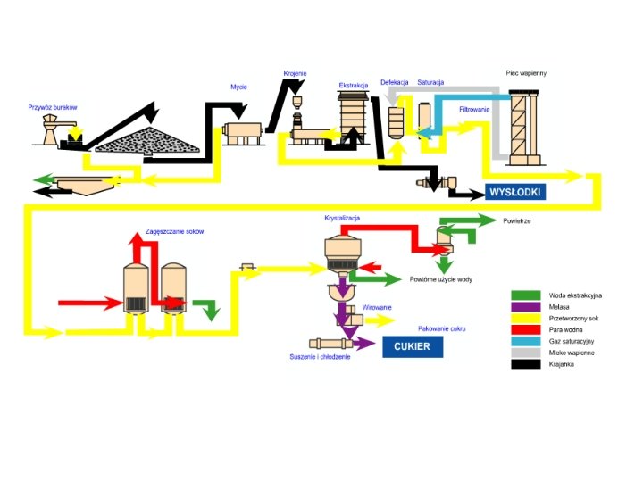 buraki cukrowe z zanieczyszczeniami filtracja osad mycie buraków czyste buraki gorąca woda substancje tworzące z zanieczyszczeniami nierozpuszczalne związki czysty roztwór sacharozy krojenie buraków odparowanie wody pokrojone buraki roztwór nasycony + kryształy sacharozy wymywanie soku oddzielanie kryształów (odwirowanie) roztwór sacharozy zawierający rozpuszczone w wodzie zanieczyszczenia wilgotne kryształy sacharozy suszenie wytrącanie zanieczyszczeń kryształy sacharozy roztwór sacharozy + osad wytworzony przez zanieczyszczenia roztwór sacharozy