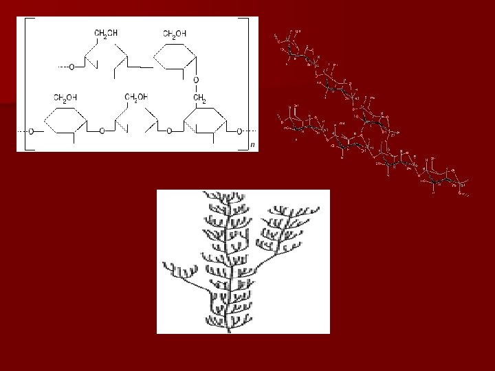 Amilopectina • formată din resturi de - glucoză unite în poziţiile (1, 4) şi (1, 6). • apare sub forma unor elice duble dispuse în lamele între care se intercalează lamele amorfe legate în poziţiile 1 -6 formate din amiloză • insolubila in apa rece • solubila in apa calda cu formarea unui gel