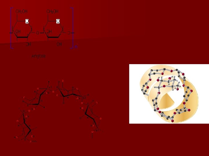 Amilopectina • formată din resturi de - glucoză unite în poziţiile (1, 4) şi (1, 6). • apare sub forma unor elice duble dispuse în lamele între care se intercalează lamele amorfe legate în poziţiile 1 -6 formate din amiloză • insolubila in apa rece • solubila in apa calda cu formarea unui gel