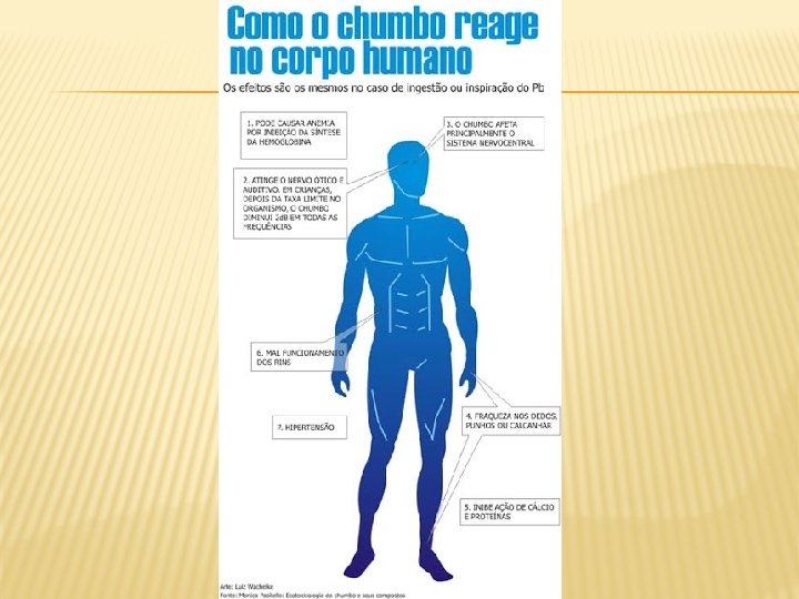 CHUMBO � O Pb interfere nos processos genéticos ou cromossômicos e produz alterações na estabilidade da cromatina em cobaias, inibindo reparo de DNA, o que relaciona este composto como promotor do câncer. � Alguns sintomas podem ser: fadiga, dores de cabeça, insônia, anorexia, alterações sensoriais, miocardice crônica, hipertensão, alterações cérebro vasculares.