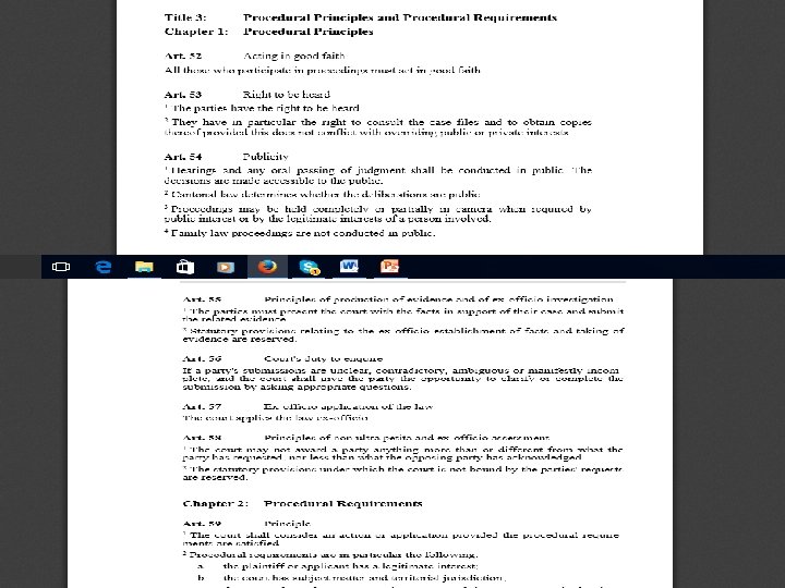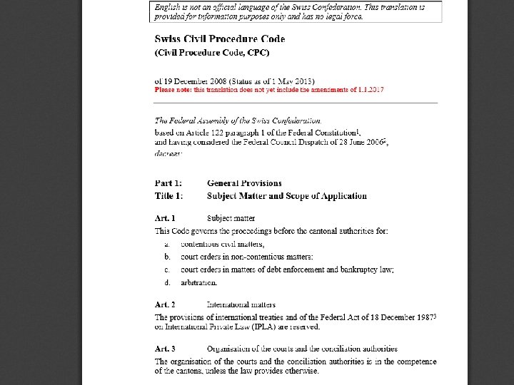 Swiss Code of Civil Procedure Part 1: General Provisions Title 1: Subject Matter and Scope of Application Art. 1 – 3 Title 2: Jurisdiction of the Courts and Recusal (4 -51) Title 3: Procedural Principles and Procedural Requirements Chapter 1: Procedural Principles (52 -58) Chapter 2: Procedural Requirements (59 -61) Title 4: Pendency and Effects of Withdrawal of the Action (62 -65) Title 5: Parties and Participation of Third Parties (66 – 90) Title 7: Value in Dispute Title 8: Costs and Legal Aid Title 9: Director of Proceedings, Procedural Acts and Deadlines Title 10: Evidence (150 -196) Part 2: Special Provisions Title 1: Attempt at Conciliation Title 2: Mediation Title 3: Ordinary Proceedings (219 -247 Title 5: Summary Proceedings Title 6: Special Proceedings in Marital Law Title 9: Appellate Remedies (308 – 334) Title 10: Enforcement Part 3: Arbitration