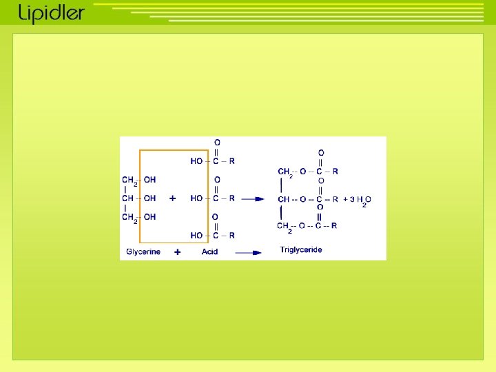 Lipidler 3. 2. Lipidlerin Kimyasal Yapısı 3. 2. 1. Trigliserid Yağların tamamına değerlikli yakın kısmı, üç alkol olan bir gliserin (C 3 H 5(OH)3) ile farklı özelliklerdeki yağ asitlerinin (RCOOH) esterleşmesinden meydana gelmektedir. Bu esterleşme sonucunda trigliserid (triaçilgliserol, triester) molekülleri oluşur. Trigliserid molekülünün yaklaşık %94 -96’sını yağ asitleri oluşturmaktadır. Ayrıca trigliserid molekülündeki reaktif grupların büyük bir kısmı yağ asiti radikallerinden (R-COO-) kaynaklanmaktadır. Majör bileşen olan trigliseridlerdeki yağ asitlerinin çeşitliliği, oranları, trigliserid molekülü üzerinde yerleşimleri vb. nedenlere bağlı olarak yağların birçok fiziksel, kimyasal ve biyokimyasal özellikleri önemli düzeylerde değişir. Sonuç olarak yağların özelliklerini büyük ölçüde yağ asitleri etkilemekte ve hatta belirlemektedir. Gliserin (gliserol) ve yağ asitleri lipaz enziminin etkisinde ve uygun koşullarda esterleşerek denklemde verildiği gibi trigliseridleri oluşturur.