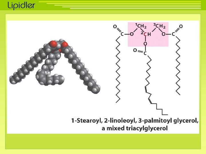 Lipidler 3. 2. 2. Trigliseridlerin Sınıflandırılması içermemektedir. Doğal yağlar genelde trigliserid karışımıdır. Her trigliseridte, farklı zincir uzunluğunda ve doymamışlık derecesinde çeşitli yağ asitleri bulunabilmektedir. Gliserinin esterleşme kabiliyetinde olan üç hidroksil grubu, esterleşen yağ asitleri ile çok sayıda kombinasyon yapmaktadır. Bu açıdan yağ asidi moleküllerinin bu şekildeki varyasyonları nedeniyle önemli farklılıklar ortaya çıkmaktadır. Bu bağlamda, trigliserid yapıda yer alan yağ asitlerinin aynı veya farklı olmasına göre basit ve karışık trigliseridler olarak sınıflandırma yapılır. Gliserinin her üç hidroksil grubu aynı çeşit yağ asiti ile esterleşmiş trigliseridlere basit trigliseridler denir. Örneğin palmitik asit içerenler tripalmitin, stearik asit içerenler tristearin, oleik asit içerenler ise triolein olarak isimlendirilir. Basit trigliseridlere doğal yağlarda az miktarlarda rastlanmaktadır.