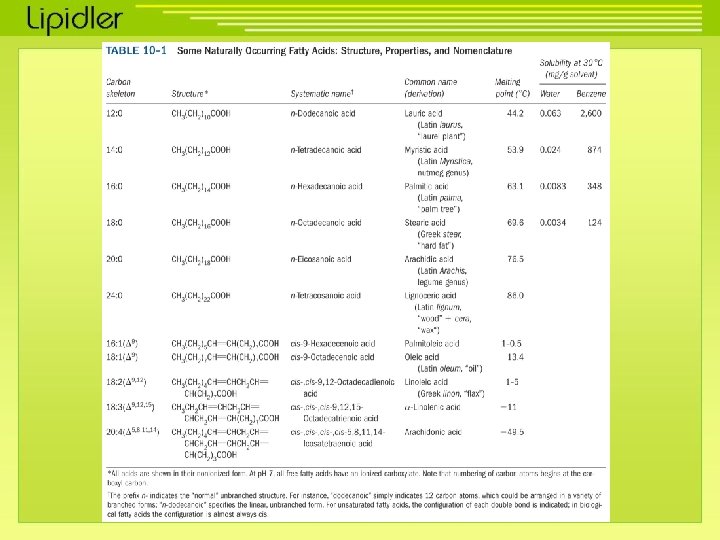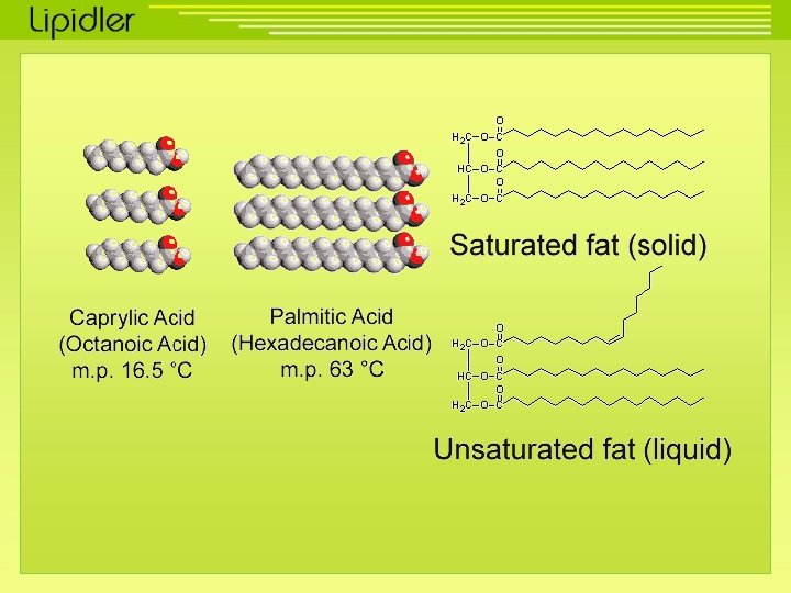 Lipidler Donma, ergime ve kaynama noktaları karbon sayısı arttıkça yükselmektedir. Fakat tek karbon sayılı yağ asidinin ergime noktası bir önceki çift karbon sayılı asidinkine göre daha düşüktür. Örneğin yağ asidi 8 karbonlu ise 16, 7 o. C, 9 karbonlu ise 12, 5 o. C ergime noktasına sahiptir. Doymuş yağ asitlerinden 4, 6 ve 8 karbon atomu içerenler oda sıcaklığında sıvıdır. 10 ve daha fazla karbon sayılı olanlar ise katı özellik gösterir. Erime ve donma dereceleri farklı olan formlarda kristalize olabilirler. Molekül ağırlıkları arttıkça kırılma indisi ve viskozite değerleri artar. Suda çözünürlükleri molekül ağırlığı arttıkça azalmaktadır. Asetik asit ve bütirik asit su ile her miktarda karışır. 6, 8 ve 10 karbonlu doymuş yağ asitleri suda çok az çözünürken 12 ve daha fazla karbon atomu içerenler ise suda çözünmemektedir. Doymuş yağ asitlerinin özellikleri esas itibarıyla karbon zincirlerinin uzunluğuna bağlıdır. Karbon zinciri uzunluğu arttıkça sıvıdan katıya, keskin kokudan kokusuz hale geçebilmektedir.