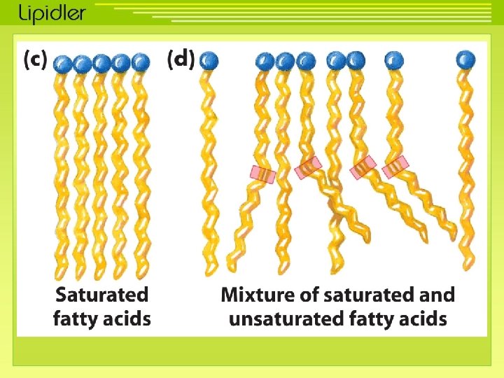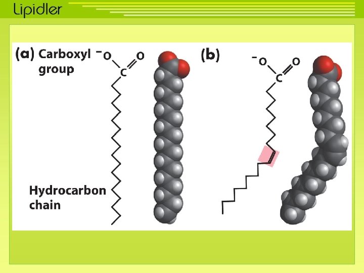 Lipidler CH 3 -…………………. . -CH 2 -CH 2 -COOH n ω 4 γ 3 β 2 α 1 Örneğin oleik asit molekülünde son metile göre çift bağ 9. karbondadır. Bu nedenle oleik asit ω– 9 (veya n– 9) yağ asidi olarak gösterilir. Linoleik asit ise ω– 6 (n– 6) yağ asidi şeklinde gösterilir. Çünkü linoleik asidin ikinci çift bağı molekülün son metil grubundan itibaren 6. karbonundadır (karboksil grubundan itibaren ise 12. ve 13. karbon atomları arasındadır). Eikosapentaenoik asit ve α-linolenik asit, omega– 3 (n– 3) yağ asitleri olarak gösterilir.