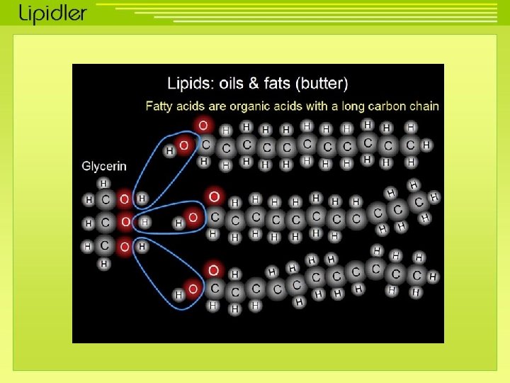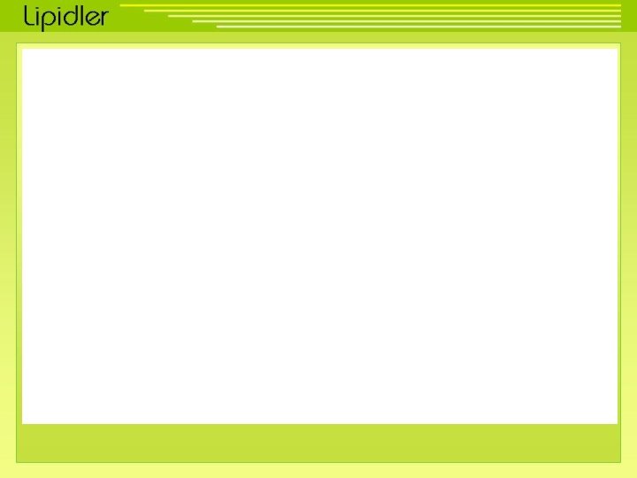Lipidler Yağlar organik bileşiklerin önemli bir grubunu oluşturur. Yağların ortak yönü tipik bir takım özelliklerinden ileri gelmektedir (örneğin, suda çözünmemeleri, organik çözücüde çözünmeleri, sabunlaşma tepkimesi vermeleri gibi). Karbonhidratlarda olduğu gibi yağların kimyasal yapılarına C, H ve O elementleri katılmaktadır. Fakat bu elementlerin miktarları arasında sabit bir ilişki bulunmamaktadır.