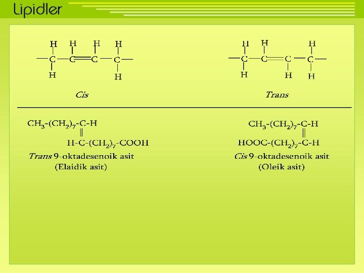 Lipidler Geometrik izomerizm: Geometrik izomerizm, çift bağlar etrafındaki karbon atomlarına bağlı hidrojen atomlarının konfigürasyonuna göre şekillenen bir izomerizmdir. Bu izomerizm hidrojen atomlarının yapıdaki konfigürasyona bağlı olarak cis veya trans şeklindeki iki formda bulunur. Hidrojen atomları karbon zincirindeki çift bağın aynı tarafında ise cis izomerler, ters yönde ise trans izomerler oluşur.