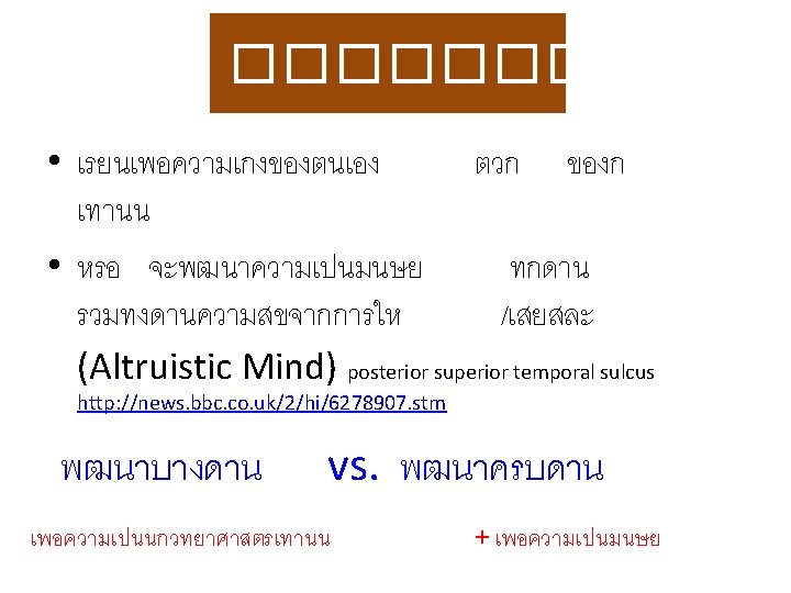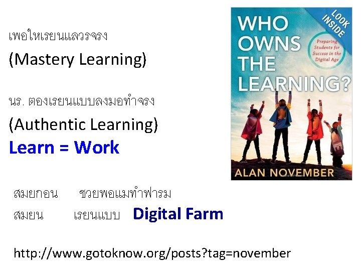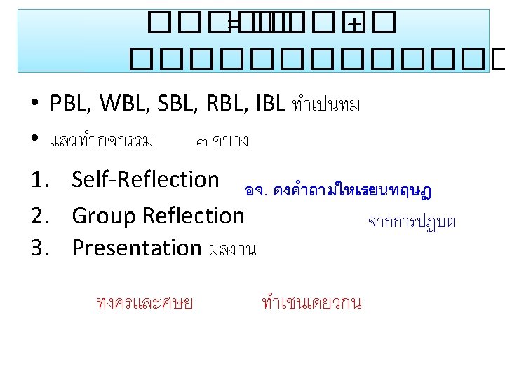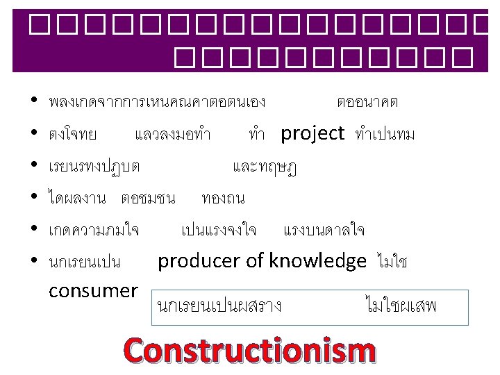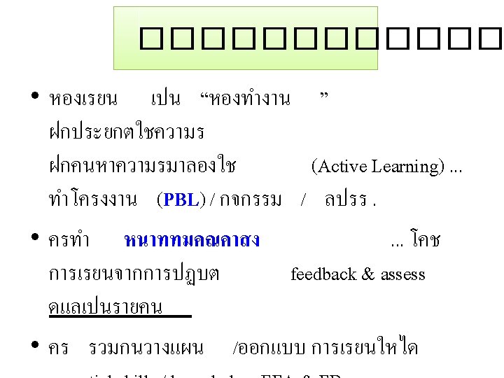 Prof Erno Lehtinen Dept of Teacher Education and Slides: 30 Download presentation Prof. Erno Lehtinen Dept of Teacher Education and the Centre for Learning Research, U of Turku, Finland 29 April 2014 Transformative Learning Level Objectives Outcome Informative • Information • Skills Experts Formative • Socialization • Values Professionals Transformative • Leadership attributes Change agents Table III-1. Levels of learning 2. เรยนรงอกงามจากภายใน 3. เปลยนสมอง 3 Rs + 7 Cs + 2 L • Reading, ‘Rithmetics + 21 st Century Themes • Critical thinking & problem solving • Creativity & innovation • Collaboration, teamwork & leadership • Cross-cultural understanding • Communication, information & media literacy (2 – 3 ภาษา) Learning • Computing & media literacy Leadership • Career & learning self-reliance • Change ����� - Five Minds หาฉลาด http: //www. gotoknow. org/posts/418836 ทำความเขาใจหลกการเรยนรสมยใหม http: //www. scbfoundation. com/publishing. php? project_id=292#publishing/292/5466 http: //www. scbfoundation. com/publishing. php? project_id=292#publishing/292/5137 http: //www. scbfoundation. com/publishing. php? project_id=292#publishing/292/5462 http: //www. scbfoundation. com/publishing. php? project_id=292#publishing/292/5649%20 เสพ สราง Constructionism 7 R-Based Principles for Smart Teaching Prior Knowledge K Organization Motivation Develop Mastery Practice & Feedback Student Development & Climate • Self-directed Learner • • • http: //www. gotoknow. org/blogs/posts/tag/Ambrose �������� “������� ” • SOLE = Self-Organized Learning Environment • http: //www. gotoknow. org/posts/560716