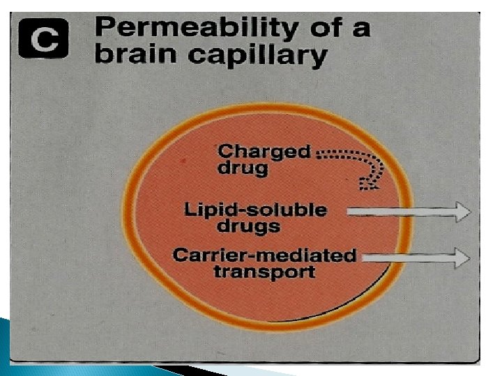 Blood brain barrier (BBB): Only lipid soluble drugs or carrier mediated transport can cross BBB. Hydrophilic drugs (ionized or polar drugs) can not cross BBB. Inflammation as in meningitis increase permeability to hydrophilic drugs e. g. penicillin & gentamycin Placental barrier Lipid soluble drugs can cross placental barrier and enter the fetal blood.