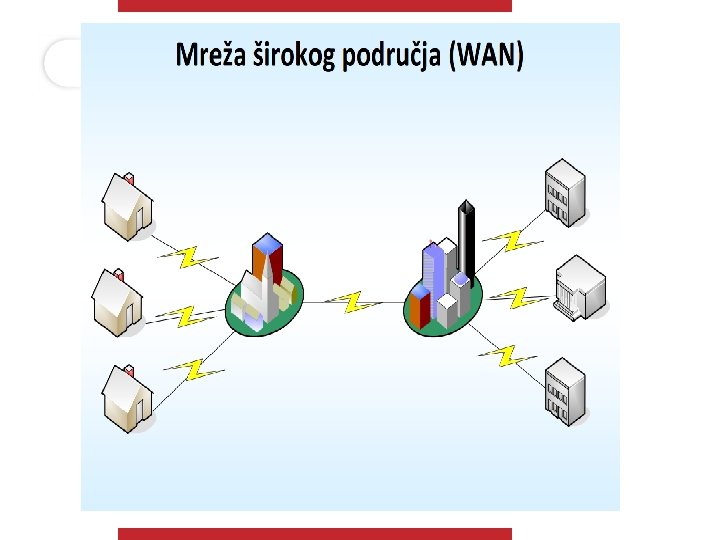 Vrste računalnih mreža 1. Vrste mreža prema udaljenosti: o LAN (Local Area Network) – mreža na užem području, npr. u školi o WAN (Wide Area Network) – mreža na širem geografskom području, npr. mreža na području države o MAN (Metropolitan Area Network) koji podrazumijeva mrežu koja se prostire preko područja jednoga grada o PAN (Personal Area Network) – mrežu s uskim područjem spajanja (npr. bluetooth).