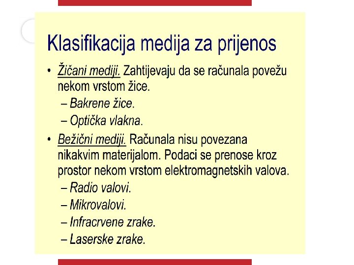 Mreža računala je sustav koji čine: § 2 ili više računala § Mediji (sredstva) za prijenos podataka: žični vodovi, bežični prijenos, optički vodovi § Komunikacijski protokol- pravila prema kojem se prenose podaci § Uređaji za upravljanjem prijenosom ( mrežni software) 4