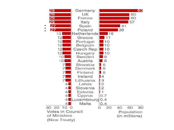 Vážené hlasování v Radě EU do r. 2014 • • • Francie, Itálie, Německo a Spojené království: 29 Polsko a Španělsko: 27 Rumunsko: 14 Nizozemsko: 13 Belgie, ČR, Maďarsko, Portugalsko a Řecko: 12 Rakousko, Bulharsko a Švédsko: 10 Dánsko, Finsko, Irsko, Litva, Chorvatsko a Slovensko: 7 Estonsko, Kypr, Lotyšsko, Lucembursko a Slovinsko: 4 Malta 3 • CELKEM 345