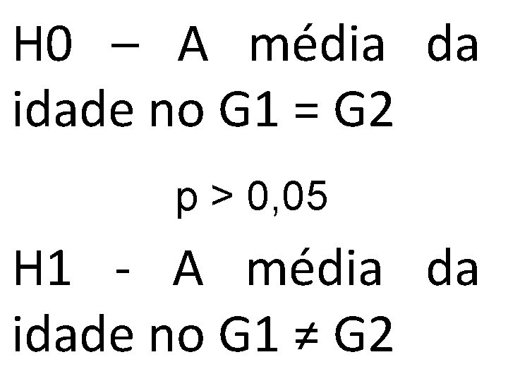 H 0 – A média da idade no G 1 = G 2 p ≤ 0, 05 H 1 - A média da idade no G 1 ≠ G 2