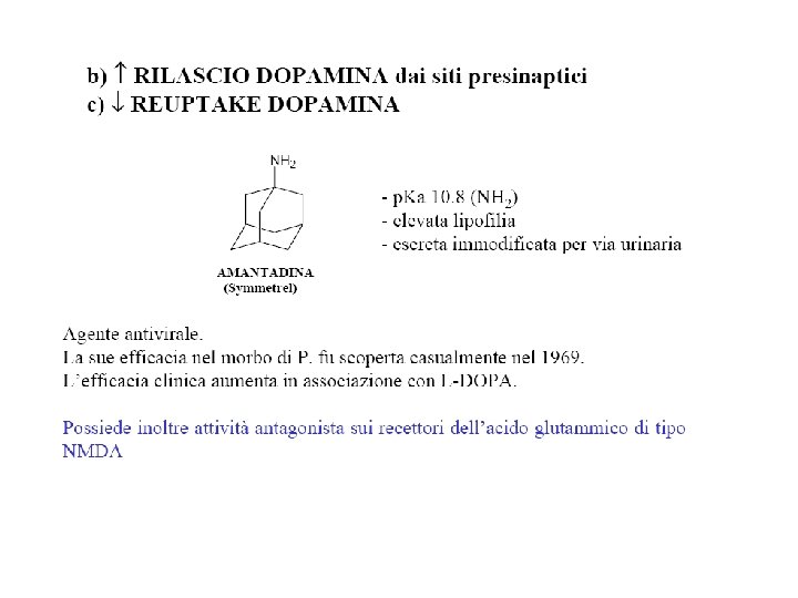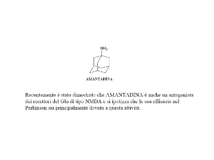 AMANTADINA (MANTADAN®) • • Questo farmaco ha modesti effetti antiparkinsoniani: aumenta il rilascio della dopamina e inibisce la trasmissione colinergica (innervazione eccitatoria). Nella fase iniziale della malattia di Parkinson, l'amantadina si è dimostrata in grado di migliorare i sintomi parkinsoniani, in particolare il tremore. Inoltre, negli stadi più avanzati della malattia, è risultata efficace nell’attenuare le discinesie indotte da levodopa, senza comprometterne l’effetto terapeutico. E’ stato anche osservato che l'amantadina potrebbe avere possibili proprietà neuroprotettive attraverso il blocco dei recettori striatali N-metil-Daspartato (NMDA) dell’acido glutammico che si ritiene possano mediare la morte dei neuroni produttori di dopamina. L'ipereccitazione dei recettori NMDA esercitata dal glutammato potrebbe essere, infatti, responsabile della perdita dei neuroni dopaminergici.