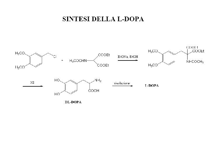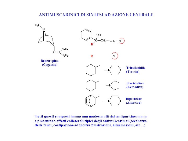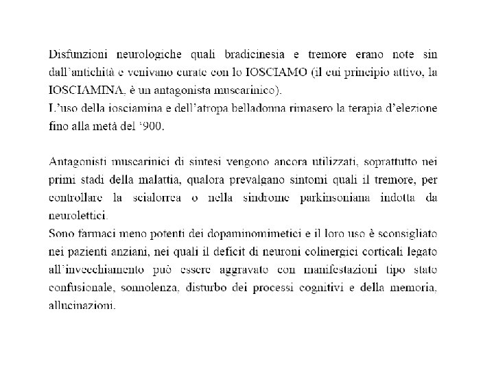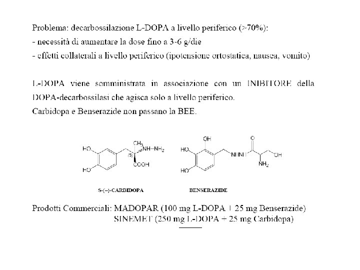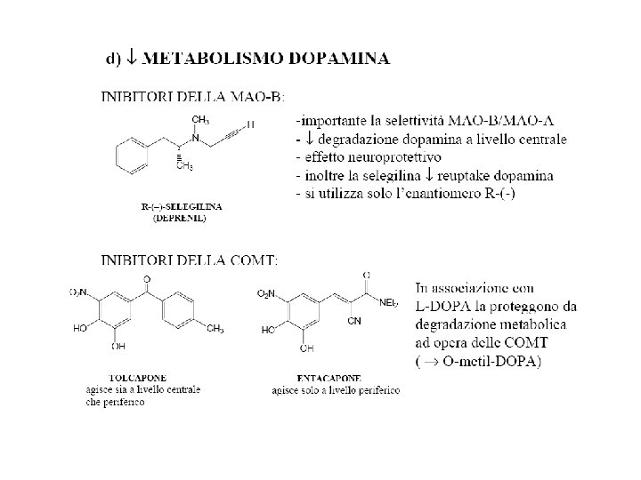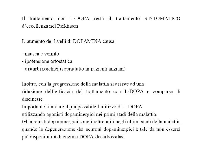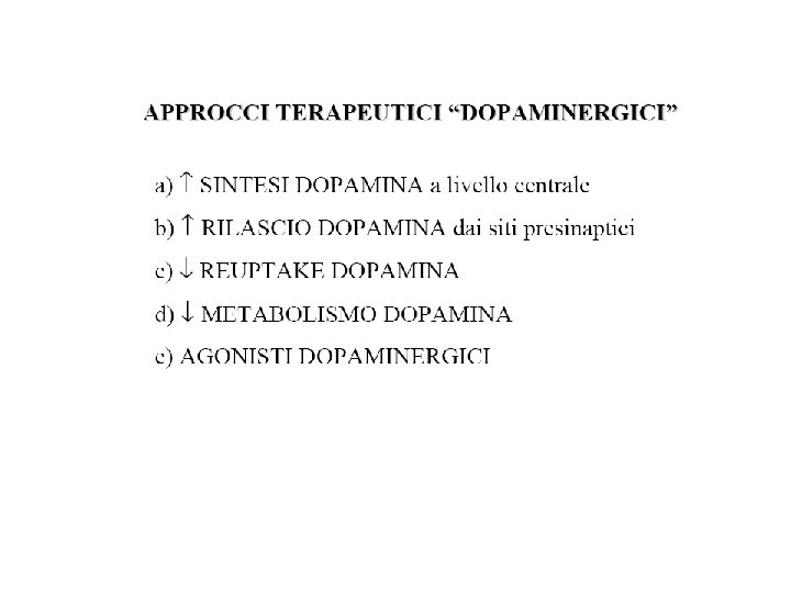 TERAPIA FARMACOLOGICA Farmaci di prima generazione: 1) LEVODOPA/CARBID OPA 2) DOPAMINOAGONISTI ERGOLINICI (bromocriptina, pergolide, carbegolina, lisuride, apomorfina), NON ERGOLINICI (ropinirolo, pramipexolo), INDIRETTI (amantadina) 3) ANTICOLINERGICI (orfenadrina, derivati carbodioici trisostituiti, benztropina) 4) INIBITORI DELLE MAO-B (selegilina) 5) INIBITORI DELLE COMT (entacapone, tolcapone)