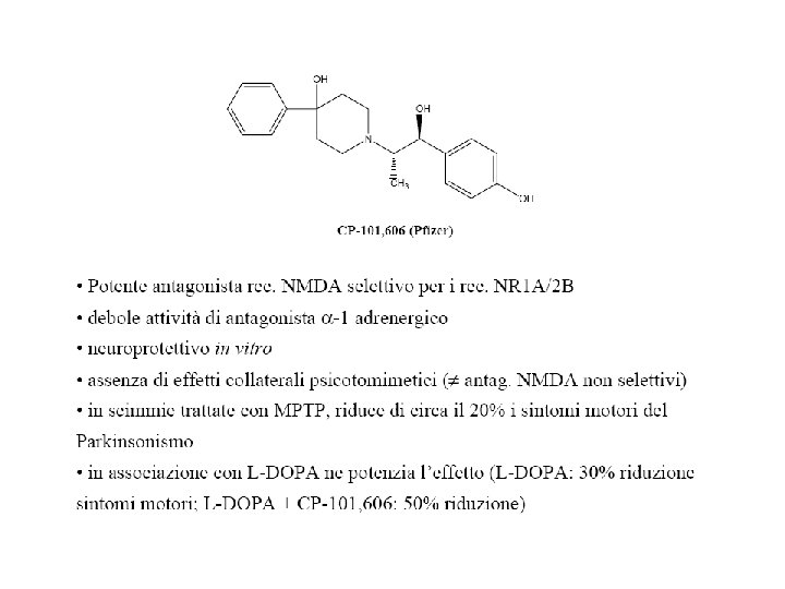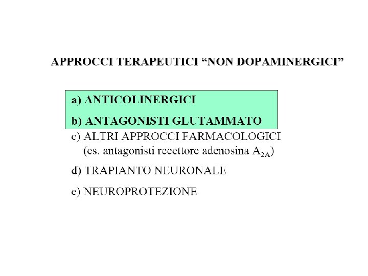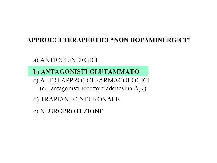 Approcci terapeutici non dopaminergici • Antagonisti del glutammato • Antagonisti del recettore dell’adenosina • Neuroprotezione