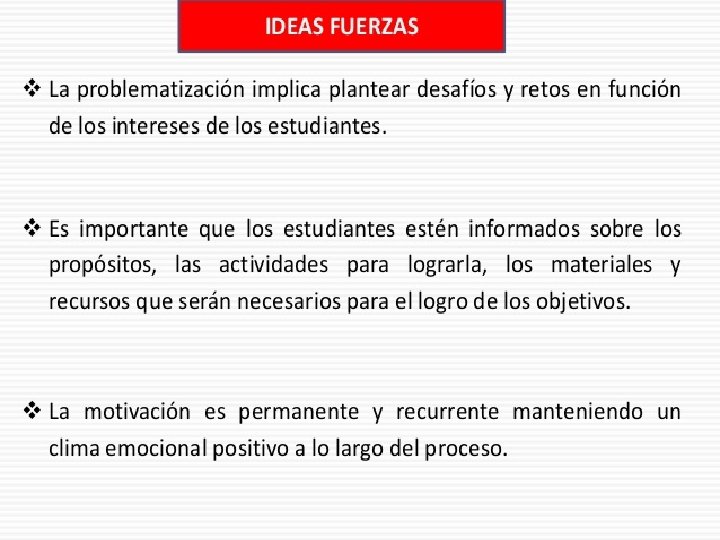 PROCESOS PEDAGÓGICOS MODELO DCN Motivación Recuperación de saberes previos Conflicto cognitivo Procesamiento de la información Aplicación/Transferencia Reflexión sobre el aprendizaje Evaluación Son procesos recurrentes y no tienen categoría de momentos fijos