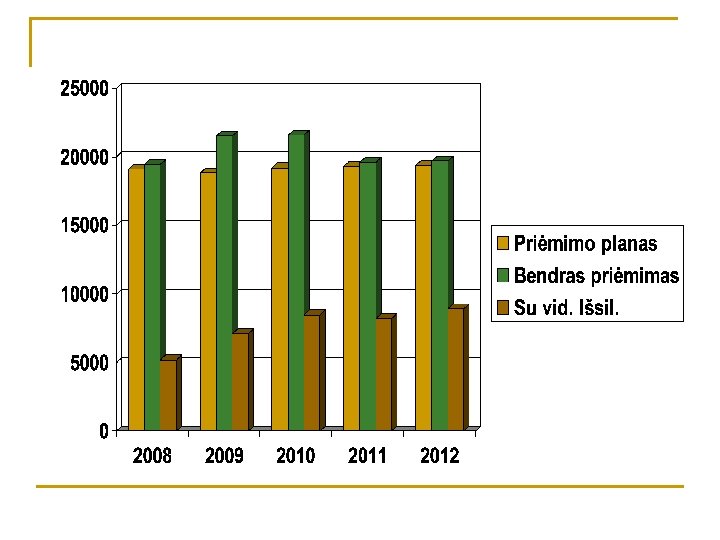 Metai 2008 2009 2010 2011 2012 Priėmimo planas 19080 18810 19200 19345 Bendras priėmimas 19430 21500 21559 19606 19681 Su vid. išsil. 5200 7100 8500 8218 8929