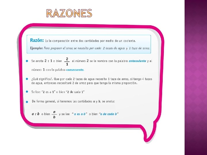 1. - Lea las siguientes situaciones, explique qué significa y escriba la razón según corresponda: a) Para preparar un queque por 4 tazas de harina se necesita 2 tazas de leche. Esto significa que por ______ tazas de harina se necesitan _______ de leche. Se escribe ______: ______ o bien _____ b) En el colegio tengo 4 horas de clases de Ciencias Naturales y 6 de Matemática Esto significa que por cada ______ horas de clases de Ciencias Naturales tengo ______ Horas de Matemática. Se escribe ______: ______ o bien ____