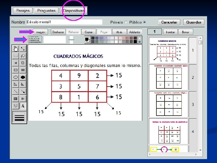 Diferentes puntos de vista para trabajar el cálculo mental: -Mejorar la rapidez del cálculo de operaciones aritméticas, algebraicas y situaciones matemáticas básicas. El Quinzet Tablas de cálculo CÁLCULO MENTAL Actividades y juegos en el aula ordinaria Actividades y juegos en el aula de ordenadores - Cifras y letras, dominós, pirámides, laberintos, juegos numéricos, …. . JCLIC , THATQUIZ, Proyecto gauss, Descartes, …. PROFESORES CON RECURSOS PROFESORADO 2. 0