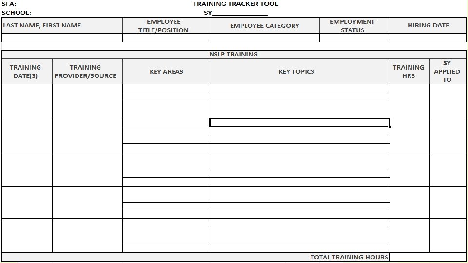 Completed Training - Year to Date SY Training Applied To Length of Training (creditable time) Training Date(s) Training Title/Subject Required Hours Employee Position: i. e. Director/Manager/Staff Hiring Date Employee Last Name Employee First Name Training Log - Sample Template