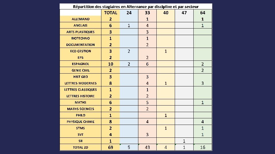 Nombre de stagiaires en alternance ISFEC Aquitaine 2014 -2015 TOTAL 24 33 40 47 64 1 D 13 1 6 1 0 5 69 5 43 4 1 16 TOTAL GENERAL 82 6 49 5 1 21 TOTAL 2 D