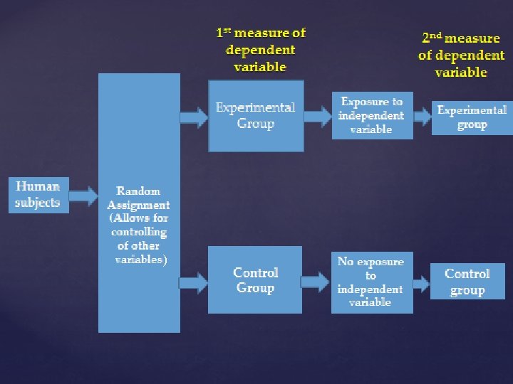EXPERIMENTAL DESIGN EXAMPLE GROUP Randomly selected subjects (Controlling for other variables: parental intelligence; age; education; income) EXPERIMENTAL INDEPENDENT VARIABLE BREAST MILK DEPENDENT VARIABLE INTELLIGENCE SCORE AGE 8 CONTROL FORMULA INTELLIGENCE SCORE AGE 8