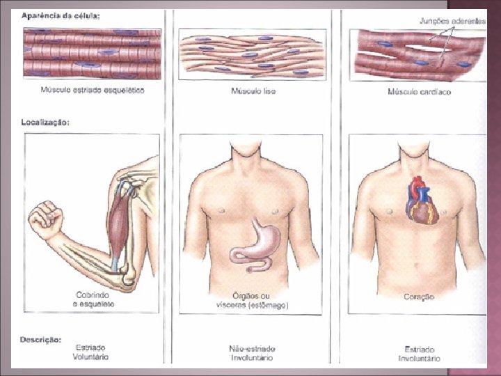 Tipos de Músculos Estriados Esqueléticos: Contraem-se por influência da nossa vontade, ou seja, são voluntários. O tecido muscular esquelético é chamado de estriado porque faixas alternadas claras e escuras (estriações) podem ser vistas no microscópio óptico. Músculos Lisos: Localizado nos vasos sangüíneos, vias aéreas e maioria dos órgãos da cavidade abdômino-pélvica. Ação involuntária controlada pelo sistema nervoso autônomo. Músculo Estriado Cardíaco: Representa a arquitetura cardíaca. É um músculo estriado, porém involuntário.