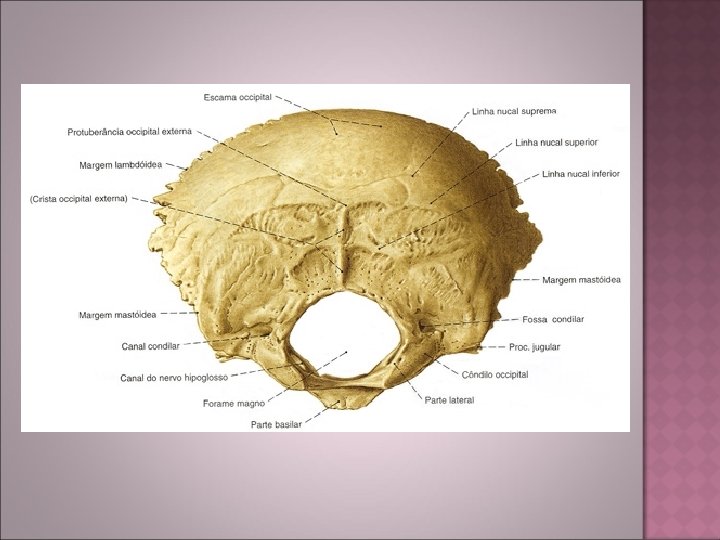 OSSOS DA CABEÇA O crânio é o esqueleto da cabeça; vários ossos formam suas duas partes: o Neurocrânio e o Esqueleto da Face. O crânio possui um teto semelhante a uma abóbada – a calvária – e um assoalho ou base do crânio que é composta do etmóide e partes do occipital e do temporal. O esqueleto da face consiste em ossos que circundam a boca e o nariz e contribuem para as órbitas.