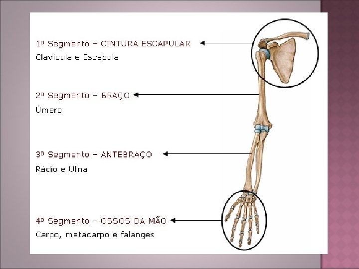 Osso do braço Úmero Osso longo, articula-se superiormente com a cavidade glenóide da escápula, e inferior ou distalmente, com o rádio lateralmente; e com a ulna medialmente. Para e obter a posição anatômica quando o osso esta desarticulado, preste atenção na cabeça, deve estar superior com a face articular voltada medialmente, com os tubérculos anteriores separados pelo sulco intertubercular.