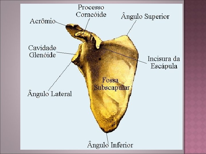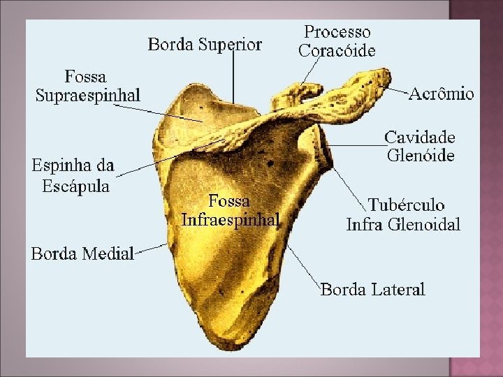 Escápula Ligada ao osso esterno pela clavícula, articula – se com o úmero pela cavidade glenóide e está situada na parede póstero – superior do tórax. Para observar sua posição anatômica, observe que sua face côncava (fossa subescapular), é anterior; sua espinha é posterior; o acrômio e a cavidade glenóide são laterais. Possui ainda bordas superior, medial e lateral e ângulos superior, inferior, lateral e acromial. Principais acidentes ósseos: Acrômio. Fossa supra – espinhal. Fossa infra – espinhal. Espinha da escápula. Processo coracóide. Fossa subescapular. Cavidade glenóide