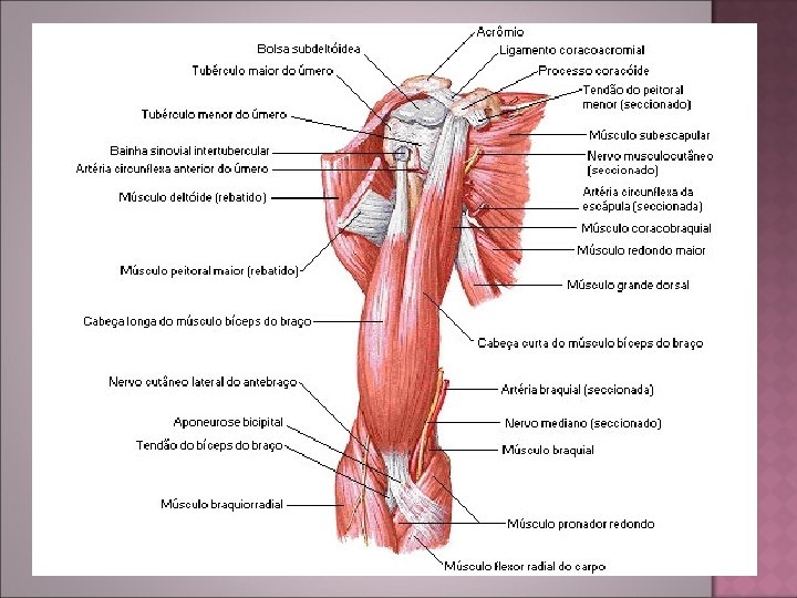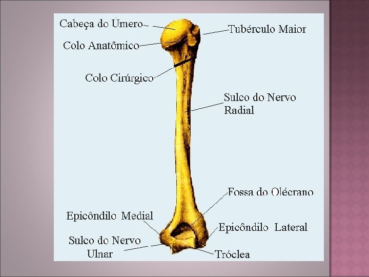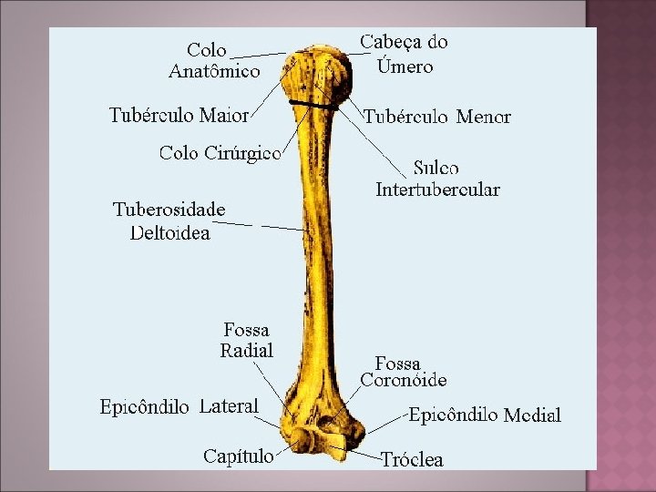 Principais acidentes ósseos: Cabeça do úmero. Tubérculo maior. Tubérculo menor. Sulco intertubercular. Colos anatômicos e cirúrgicos. Tuberosidade deltóidea. Capitulo. Tróclea. Fossa do olécrano. Face lateral. Epicôndilo medial. Fossa coronóide. Fossa radial