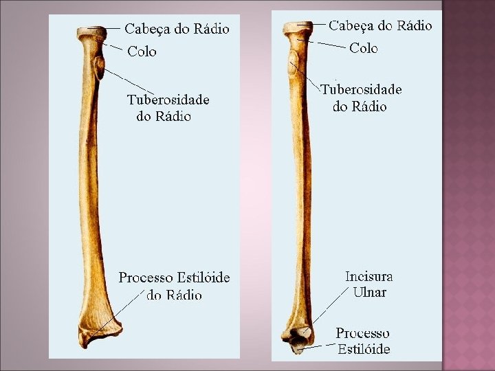 Ossos do Antebraço Rádio Também osso longo, encontrado lateralmente no antebraço, articula-se proximalmente pela concavidade da cabeça do rádio, com o capítulo do úmero, a circunferência articular da cabeça do rádio articula – se com a incisura radial da ulna. Distalmente articula – se com os ossos do carpo por meio da face articular do carpo e com a ulna por incisura ulnar. Sua extremidade maior é colocada distalmente, com sua face côncava e lisa voltada anteriormente e o processo estilóide distal e lateral. A tuberosidade radial deve ser colocada medialmente.