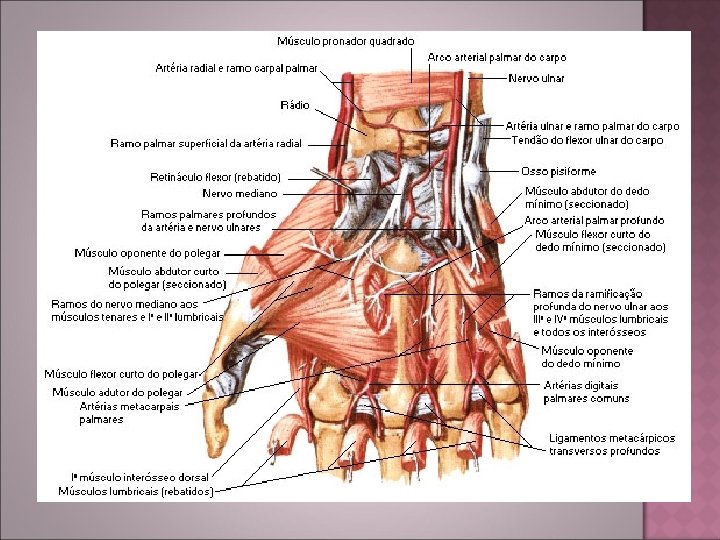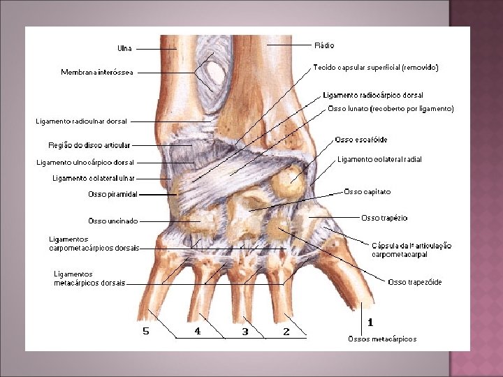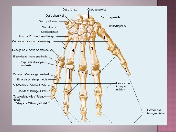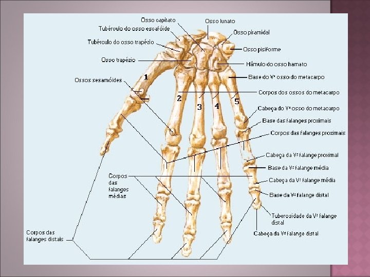 Ossos das Mãos Carpos A região denominada carpo é composta por oito ossos dispostos em duas fileiras. Primeira fileira ou fileira proximal (de lateral para medial) – escafóide, semilunar, piramidal, pisiforme. Segunda fileira ou fileira distal ( de lateral para medial) – trapézio, trapezóide, capitato e hamato. METACARPOS Numerados de I a V de lateral para medial FALANGES Cada dedo possui três falanges, com exceção do polegar, que possui apenas duas. As falanges são ditas proximais, médias e distais