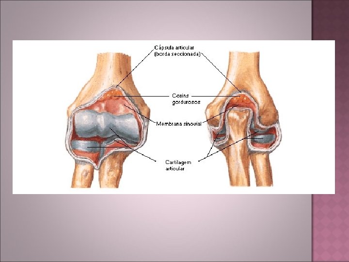 Junturas Sinoviais – A mobilidade exige livre deslizamento de uma superfície óssea contra outra e isto é impossível quando entre elas interpõe-se um meio de ligação, seja conjuntivo fibroso ou cartilagíneo. Para que haja o grau desejável de movimento, em muitas junturas, o elemento que se interpõe às peças que se articulam é um líquido denominado sinóvia ou líquido sinovial. Deste modo, os meios de união entre as peças esqueléticas articuladas não se prendem nas superfícies de articulação, como ocorre nas junturas fibrosas e cartilaginosas: nas junturas sinoviais o principal meio de união é representado pela cápsula articular, espécie de manguito que envolve a articulação prendendo-se nos ossos que se articulam.