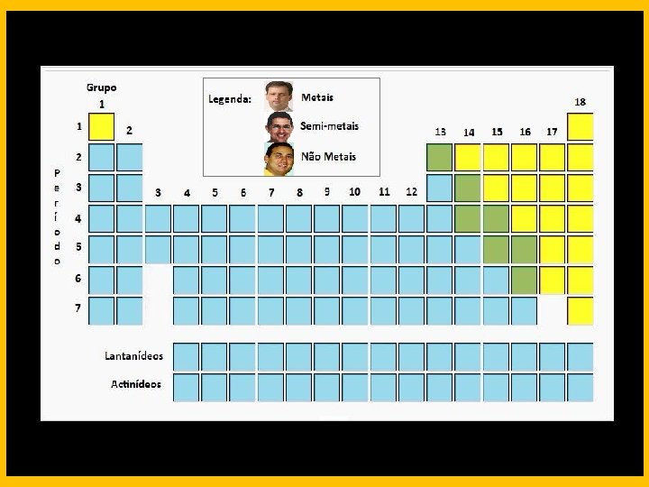 CLASSIFICAÇÃO DOS ELEMENTOS Elementos representativos: Pertencentes aos grupos 1, 2 e dos grupos de 13 a 17. Elementos de transição externa: Pertencentes aos grupos de 3 a 12.