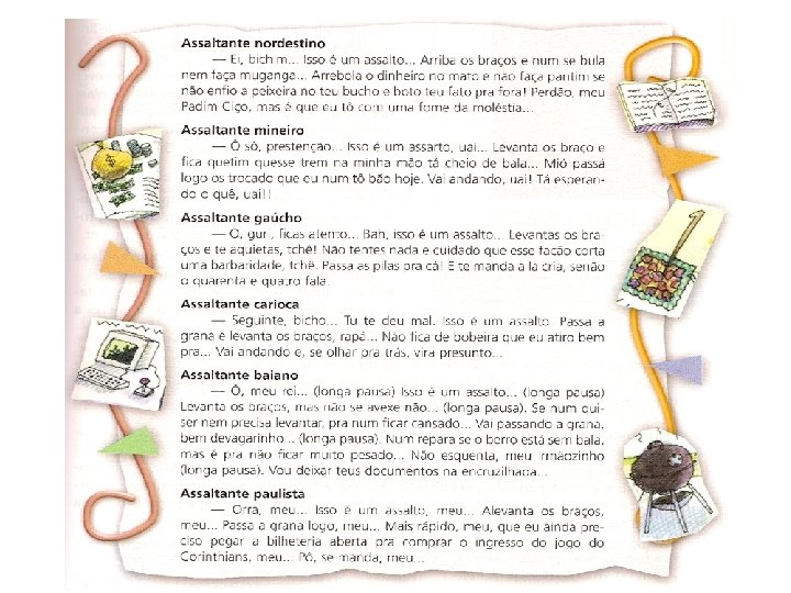 As palavras destacadas estão de acordo com a norma padrão da Língua Portuguesa? Geralmente, quais são as pessoas que a utilizam? Onde elas moram? Sabendo-se quem é o locutor do texto, qual a intencionalidade ao usar tais palavras? Você utiliza essa linguagem? Se não, qual utilizaria para substituir as que foram usadas?