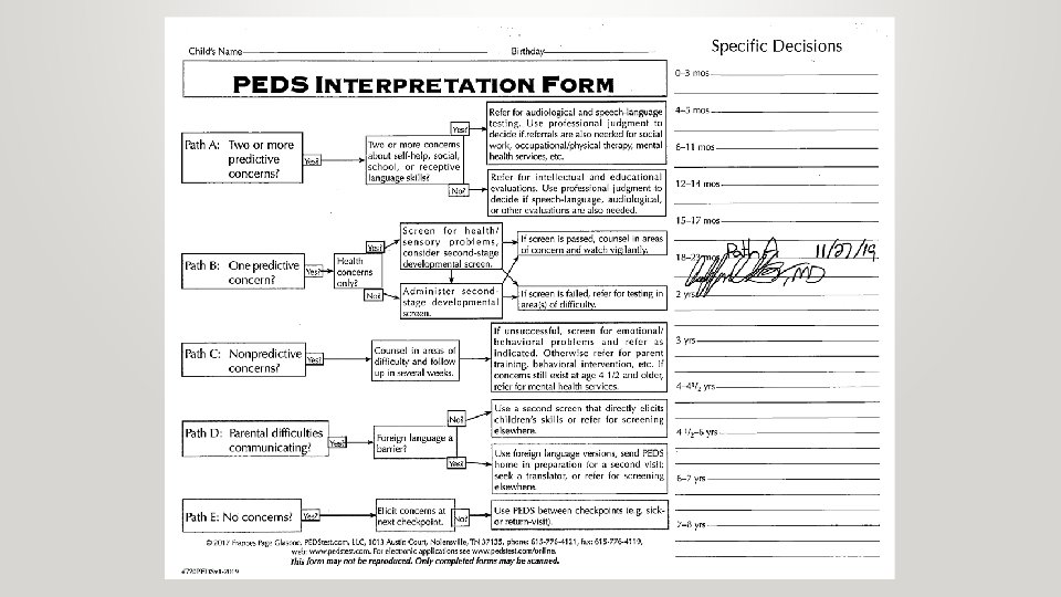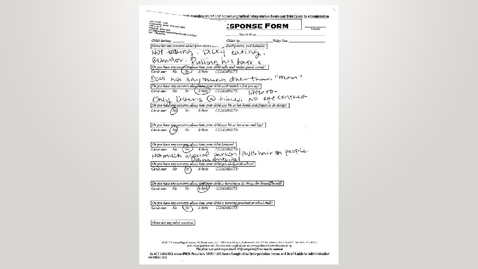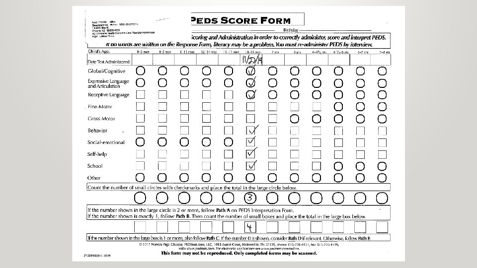 Developmental Screening Tools - PEDS • Parent interview form designed to screen for developmental and behavioral problems needing further evaluation. • Age Range: 0 -8 y • Single response form used for all ages. • Useful as a surveillance tool as well as a screening tool. • 10 items. Takes 2 -5 minutes to administer. Has electronic format that can be adapted into EHR.