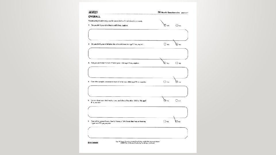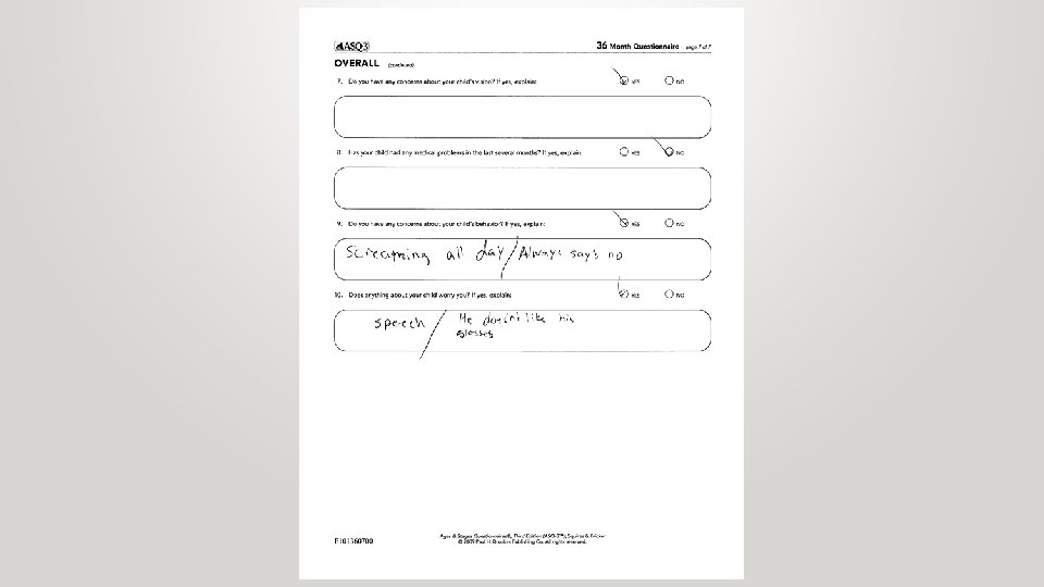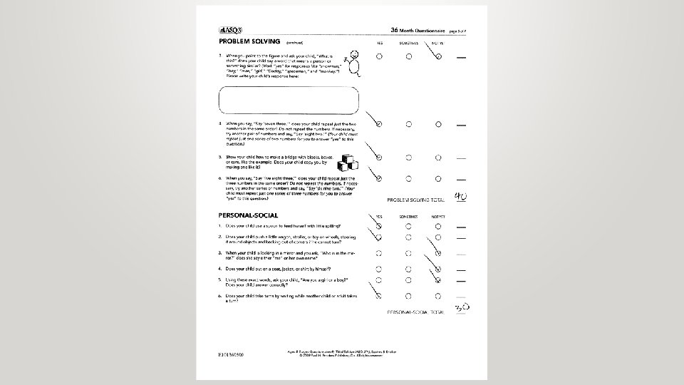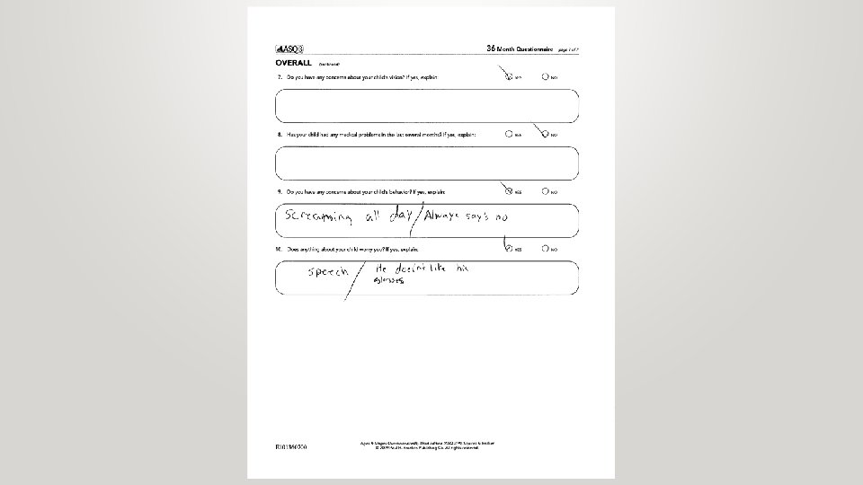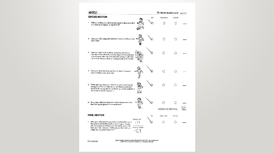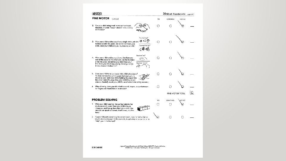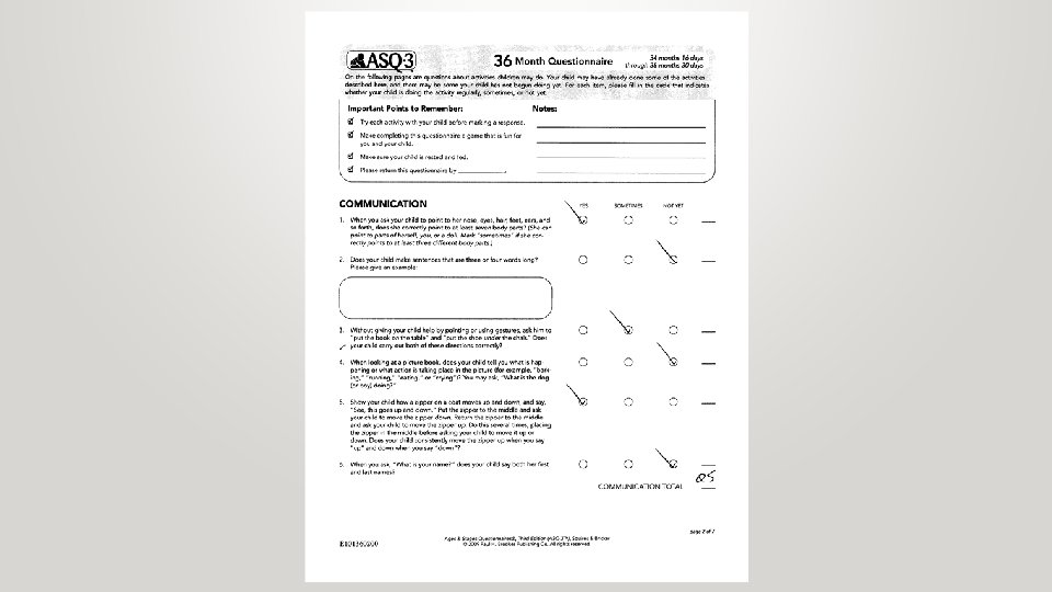 Developmental Screening Tools - ASQ • Ages and Stages Questionnaires (3 rd edition) is parent completed questionnaire with series of 21 questions screening communication, gross motor, fine motor, problem-solving and personal adaptive skills. • Results in pass, monitor, or fail scores for domains. • Age Range: 2 – 60 months. • 30 items. Takes 10 -15 minutes to administer. Has electronic format that can be adapted for an EHR.