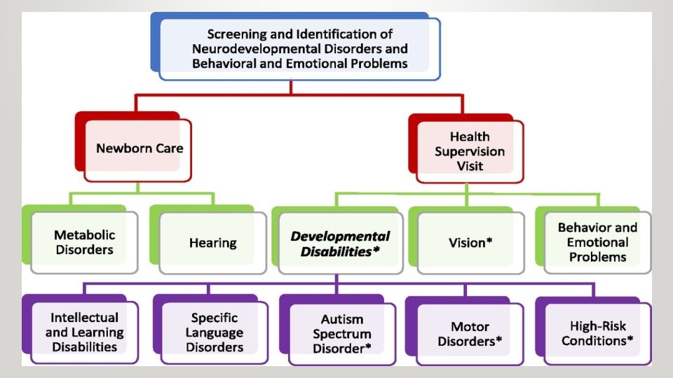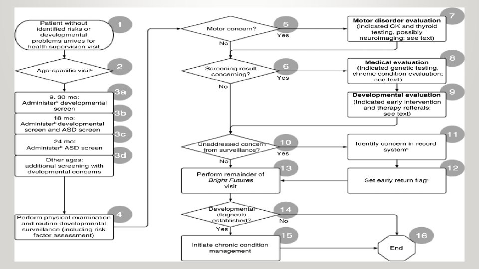 AAP 2020 Clinical Report – Developmental Surveillance and Screening • Revision of 2006 AAP policy statement on developmental surveillance and screening. • Provides an algorithm for a universal system of screening of all children in the primary care setting. • Supports developmental surveillance at every health supervision visit & administration of standardized screening tests at the 9 -, 18 - and 30 -month visits. • Developmental concerns elicited on surveillance at any visit should be followed by standardized screening test or direct referral for intervention and specialty care.