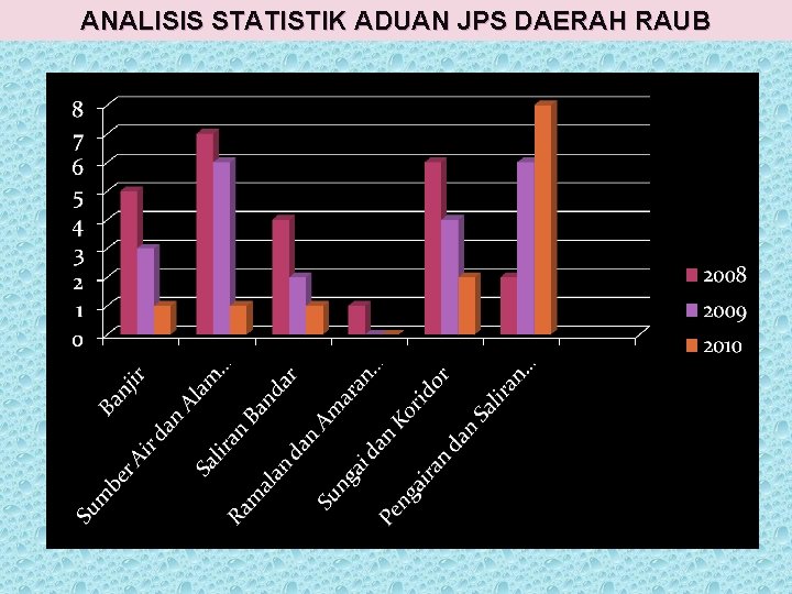 ANALISIS ADUAN JPS DAERAH RAUB BIL KETERANGAN TAHUN 2008 2009 2010 1 Banjir 5 3 1 2 Sumber Air dan Alam Sekitar 7 6 1 3 Saliran Bandar 4 2 1 4 Ramalan dan Amaran Banjir / Kemarau 1 0 0 5 Sungai dan Koridor 6 4 2 6 Pengairan dan Saliran Pertanian 2 6 8