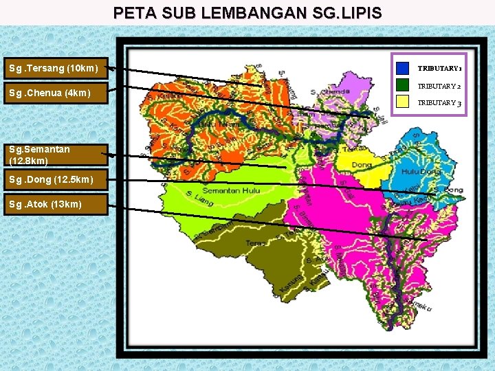 PETA SUB LEMBANGAN SG. LIPIS Sg. Tersang (10 km) Sg. Chenua (4 km) Sg. Semantan (12. 8 km) Sg. Dong (12. 5 km) Sg. Atok (13 km) TRIBUTARY 1 TRIBUTARY 2 TRIBUTARY 3
