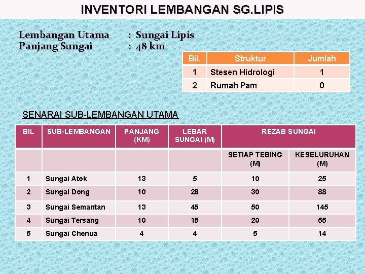 INVENTORI LEMBANGAN SG. LIPIS Lembangan Utama Panjang Sungai : Sungai Lipis : 48 km Bil. Struktur Jumlah 1 Stesen Hidrologi 1 2 Rumah Pam 0 SENARAI SUB-LEMBANGAN UTAMA BIL SUB-LEMBANGAN PANJANG (KM) LEBAR SUNGAI (M) REZAB SUNGAI SETIAP TEBING (M) KESELURUHAN (M) 1 Sungai Atok 13 5 10 25 2 Sungai Dong 10 28 30 88 3 Sungai Semantan 13 45 50 145 4 Sungai Tersang 10 15 20 55 5 Sungai Chenua 4 4 5 14